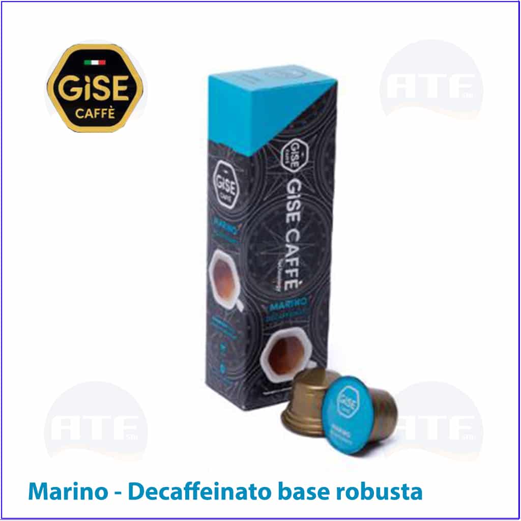 Gise Caffè Marino Decaffeinato, Miscela decaffeinata a base di Robusta selezionata con sentori di frutta secca, noci, cioccolato, e Liquirizia. Dal gusto caldo e piacevole come il “Marino”.